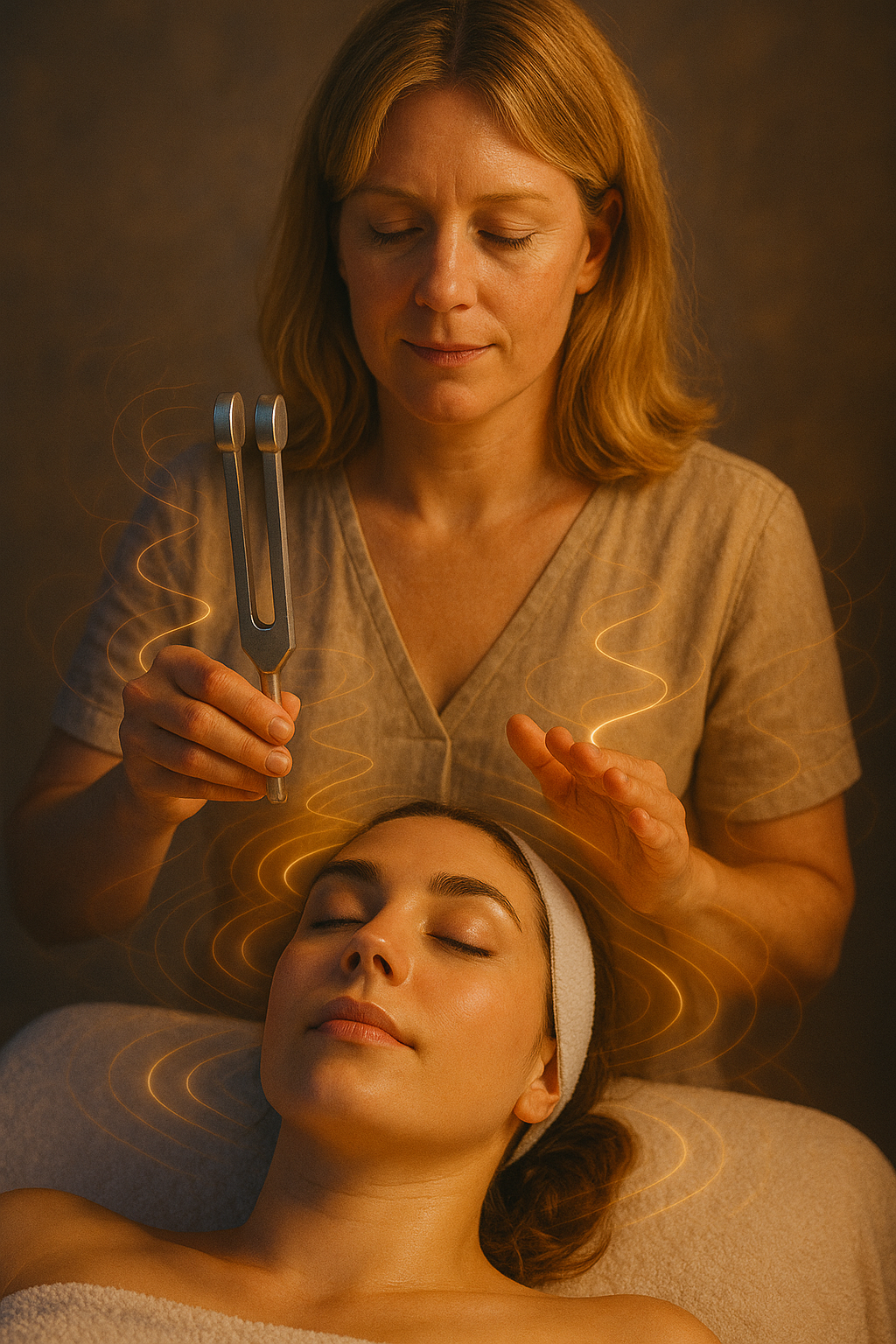Specific tuning forks ( metal-based) will be used at targeted points on the face, neck and around the head.